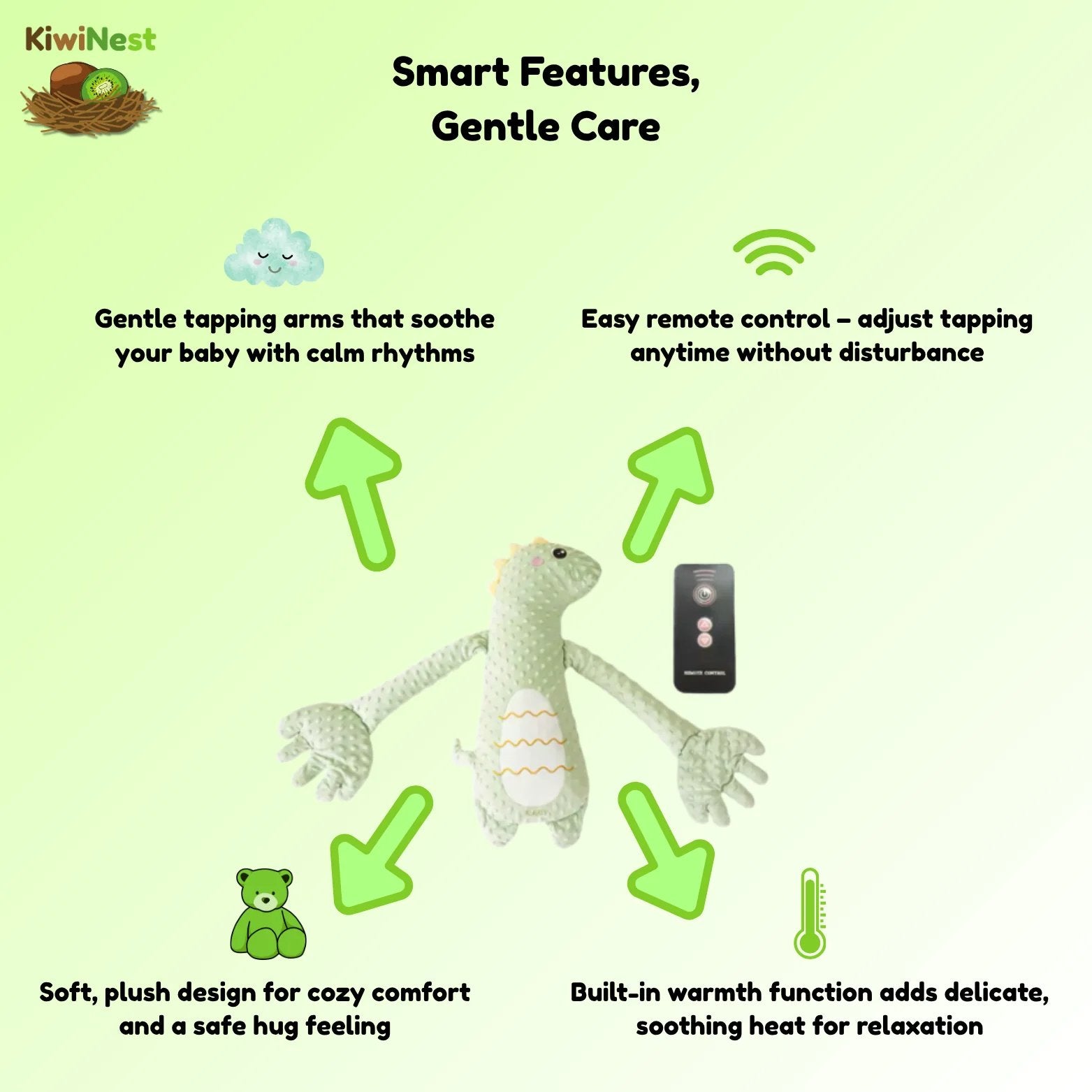 Warmth + vibrations trigger sleep cues in 15 mins; ☀️ Day Mode: Textured ears boost motor skills, cool bean pouch eases teething pain; 🚗 On-the-Go: Clip to strollers for instant calming vibrations.